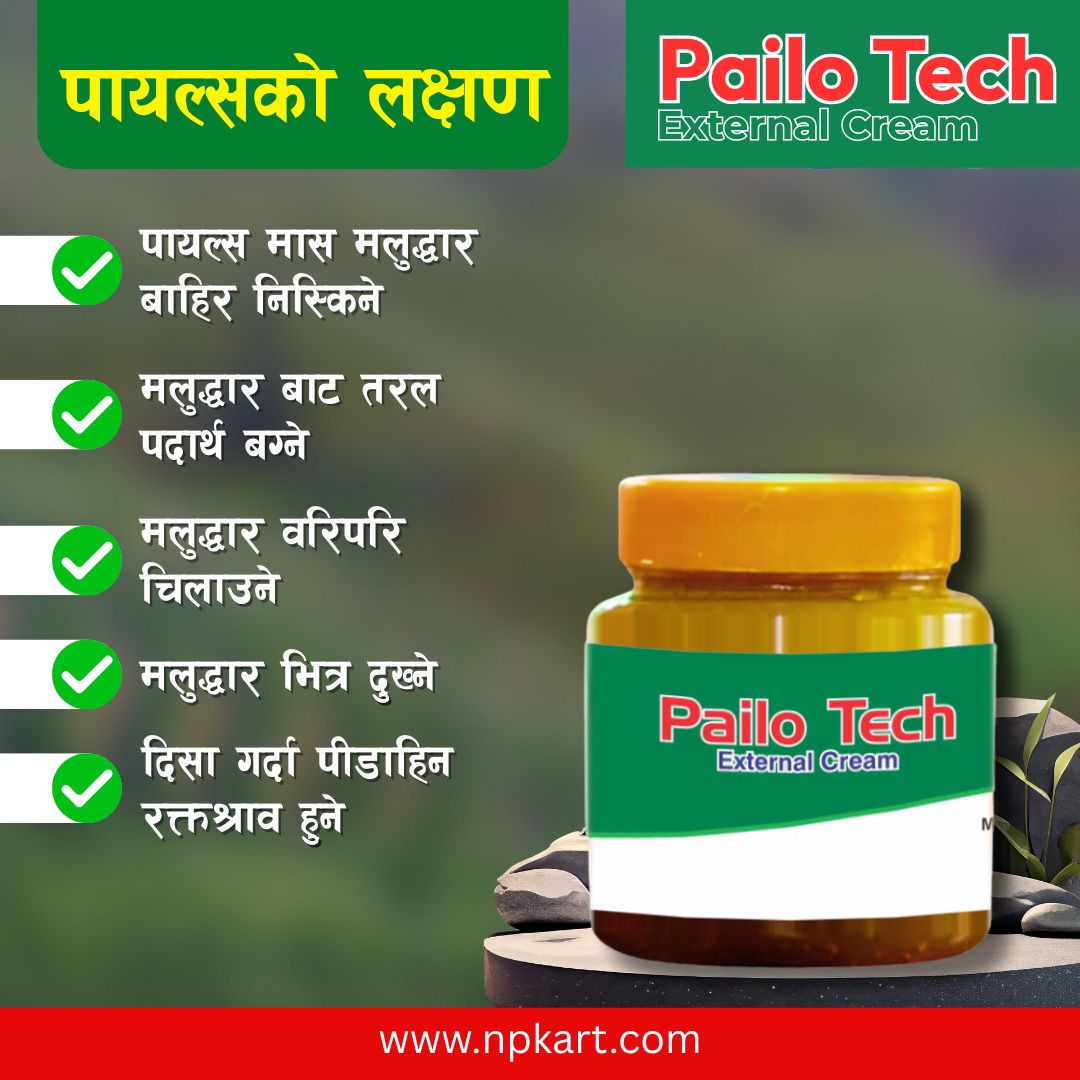 अब पाइल्स भुलेर दुखाई बाट मात्र एकमहिना आराम पाउनुहोस् । प्रस्तुत गर्दा छौं Pailo Tech External Cream पाइल्स निवारक क्रिम ।